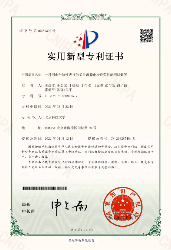 [1] 王晨洋,王金龙,于珊珊,于得水,马克骏,张与豪,谢子昂,张师平,陈森,吴平. 一种用电学特性表征的柔性薄膜电极疲劳性能测试装置[P]. CN216285484U, 2022-04-12.