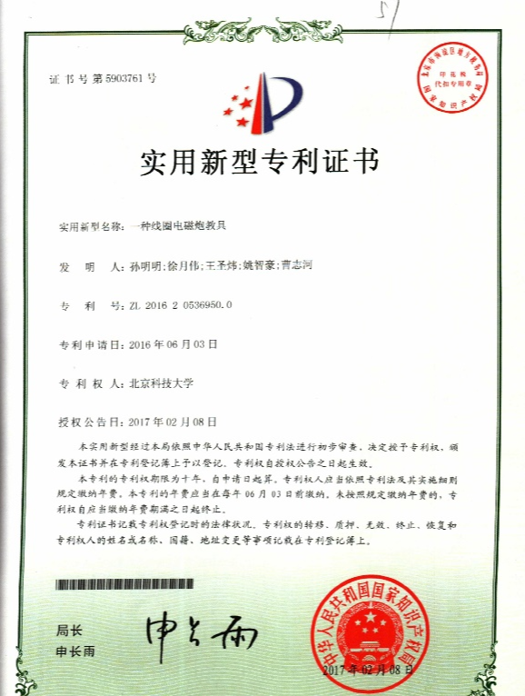 [6] 孙明明,徐月伟,王圣炜,姚智豪,曹志河. 一种线圈电磁炮教具[P]. CN205943248U, 2017-02-08.