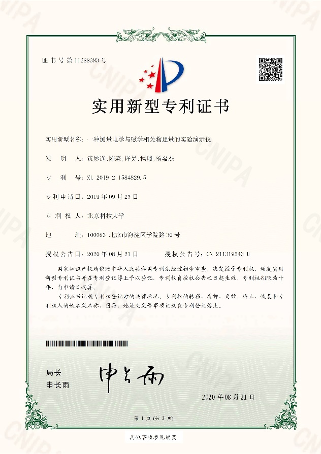 [3] 黄妙逢,陈森,许昊,程翔,杨嘉杰. 一种测量电学与磁学相关物理量的实验演示仪[P]. CN211319543U, 2020-08-21.