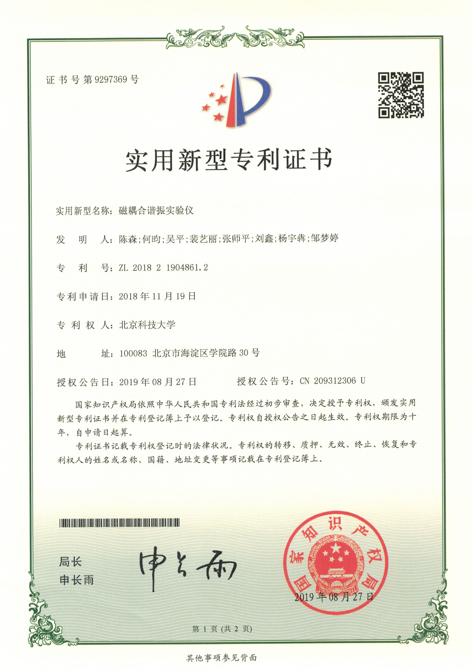 [5] 陈森,何昀,吴平,裴艺丽,张师平,刘鑫,杨宇犇,邹梦婷. 磁耦合谐振实验仪[P]. CN209312306U2019-08-27.