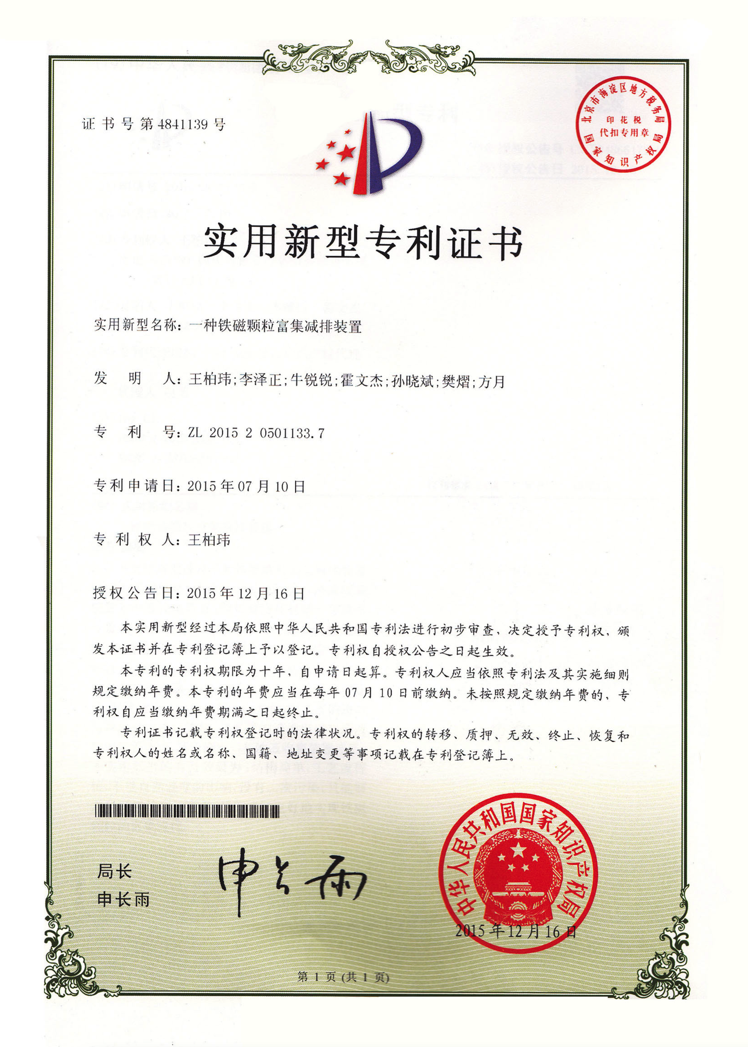 [7] 王柏玮,李泽正,牛锐锐,霍文杰,孙晓斌,樊熠,方月. 一种铁磁颗粒富集减排装置[P]. CN204866172U,2015-12-16.