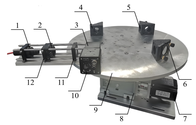 1、激光器;2、偏振片;3、分光棱镜及固定架;4、分光镜及角度调节固定架;5、分光镜及角度调节固定架;6、分光镜及角度调节固定架;7、驱动电机;8、转轴结构;9、转动平台;10、CCD;11、准直镜;12、扩束镜。