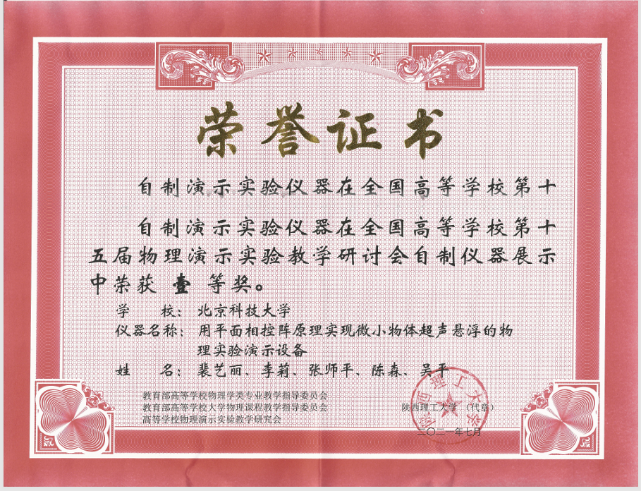 微小固体的超声波悬浮与三维移动演示设备获奖证书