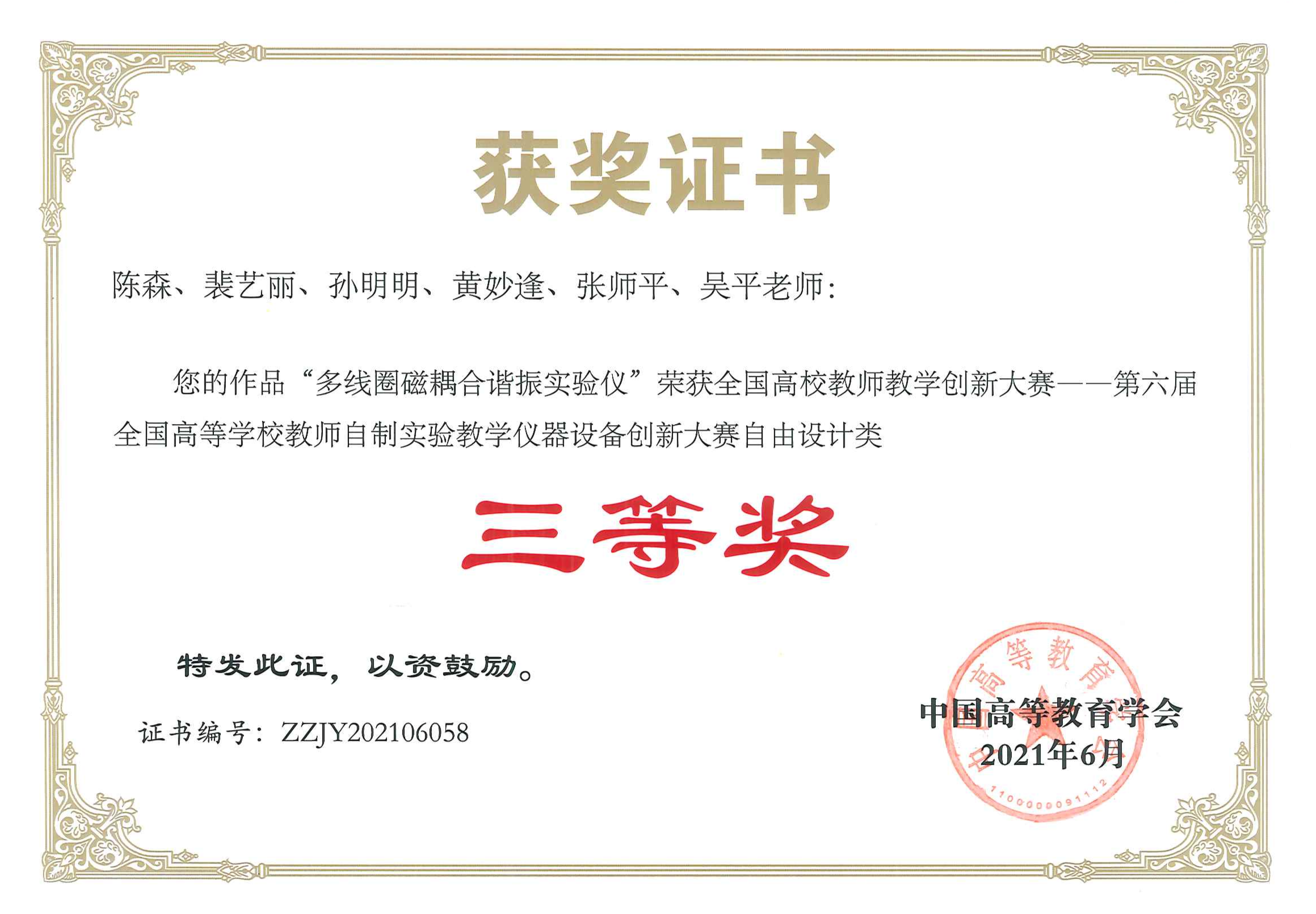 磁耦合谐振与无线能量传输实验装置获奖证书