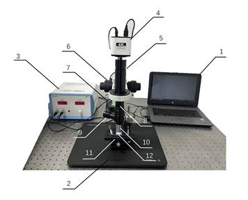 1-计算机及相关软件;2-布朗运动实验仪;3-温控仪;4-电子目镜;5-镜筒;6-调焦手轮;7-同轴光源可调电源;8-变焦环;9-同轴光源;10-显微物镜;11-变温载物台;12-待测样品(微粒悬浮液)