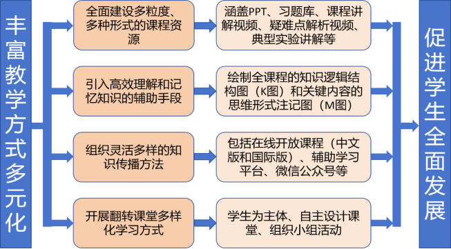 为了解决教学资源少和传播方式单一与学生学习方式和学习习惯多样化之间的矛盾问题,建设了一套多元化教学资源,促进学生全面发展。一是全面建设了包括PPT、习题库、讲解视频、疑难点解析视频、典型实验讲解等在内的多粒度、多模态教学资源。二是精细绘制了全课程的知识逻辑结构图(K图)和思维形式注记图(M图),帮助高效理解和记忆知识,并组织学生参与到KM图的绘制中,加深知识理解,整体提升学生逻辑思维。三是系统组织了在线开放课程、辅助学习平台、微信公众号等多种互相耦合的传播方式,满足了学生多样化的个性学习要求。四是开展翻转课堂,以学生为主体,学生走上讲台,学习知识的同时,勇于表达自己。翻转课堂通过个性化辅导,关注学生的个体差异,促使每个学生在充分发展自身优势的同时,弥补不足,实现全面发展。