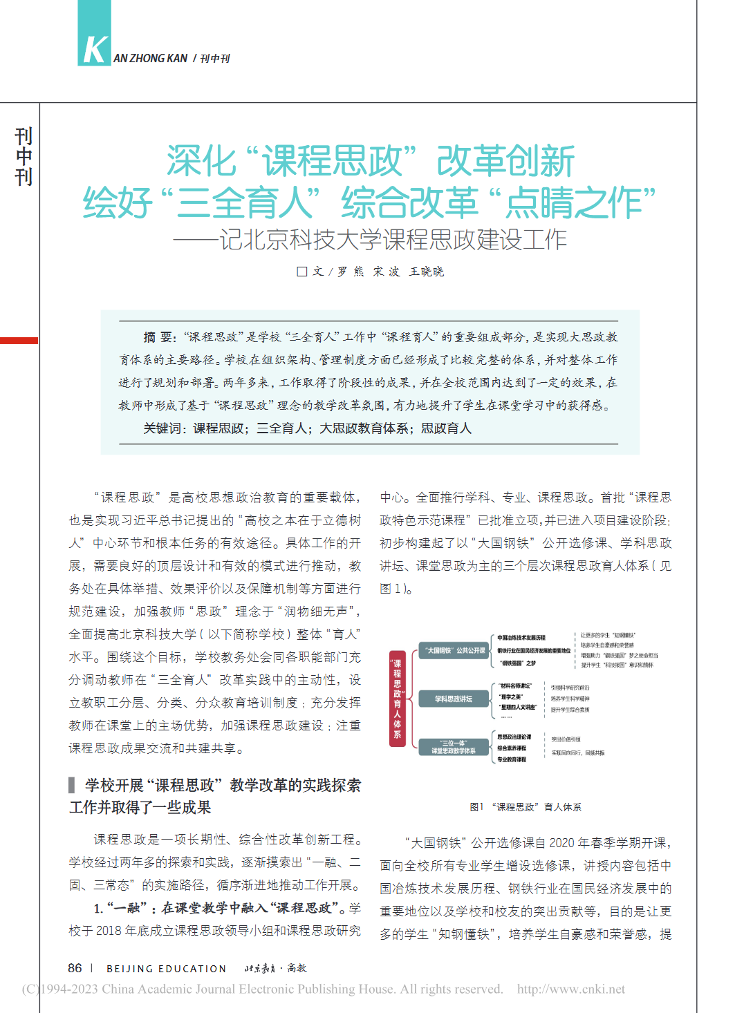 [72] 罗熊,宋波,王晓晓,深化“课程思政”改革创新绘好“三全育人”综合改革“点睛之作”——记北京科技大学课程思政建设工作,北京教育(高教),2021,(3):86-89.
