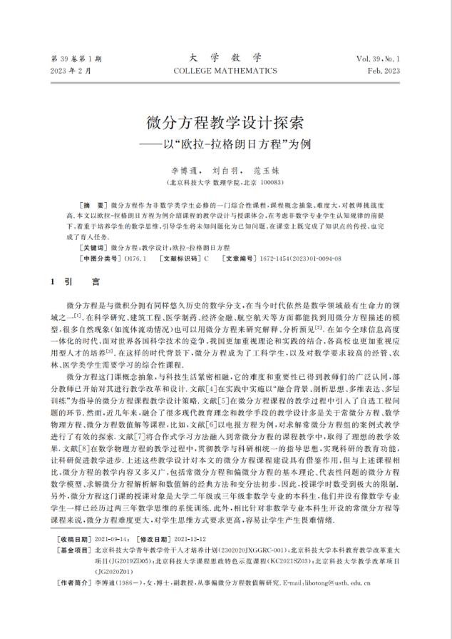 [16] 李博通,刘白羽,范玉妹,微分方程教学设计探索——以“欧拉-拉格朗日方程”为例,大学数学,2023,39(1):94-101.