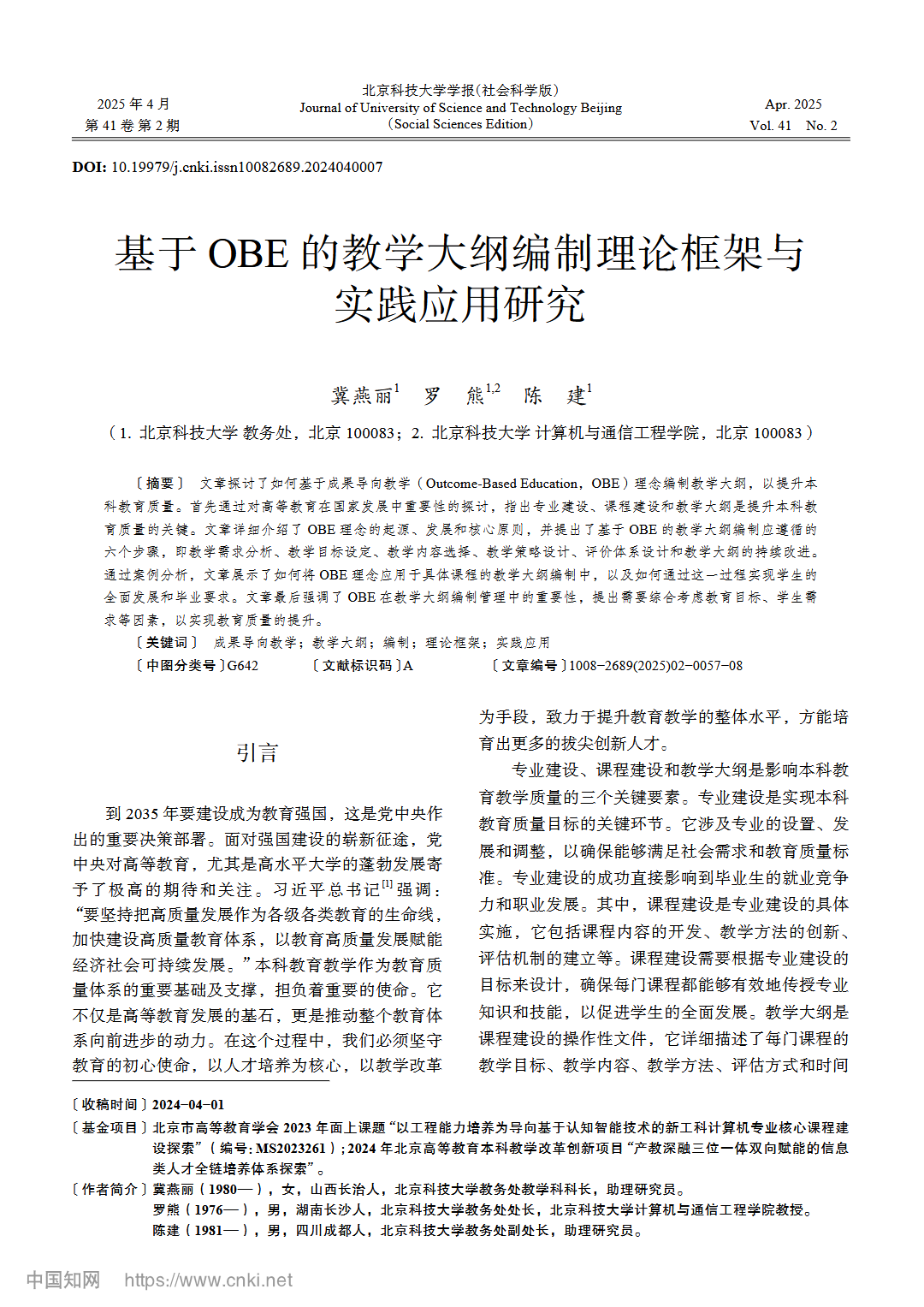 [41] 冀燕丽,罗熊,陈建,基于OBE的教学大纲编制理论框架与实践应用研究,北京科技大学学报(社会科学版),2025,41(2):57-64.