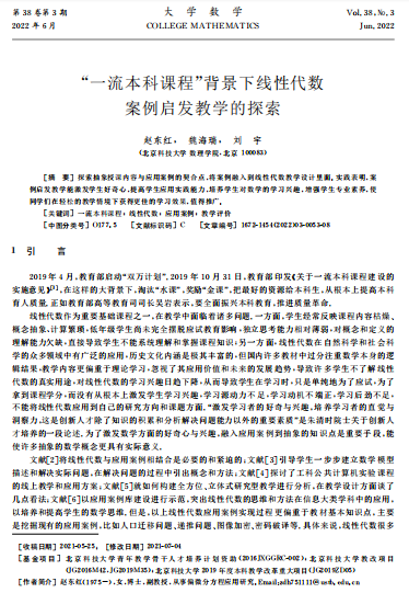 [15] 赵东红,魏海瑞,刘宇,“一流本科课程”背景下线性代数案例启发教学的探索,大学数学,2023,38(3):53-60.