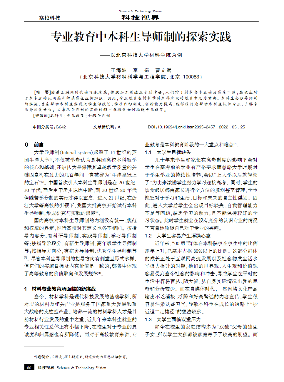 [38] 王海波,李娟,曹文斌,专业教育中本科生导师制的探索实践——以北京科技大学材料学院为例,科技视界,2022,(5):80-82.