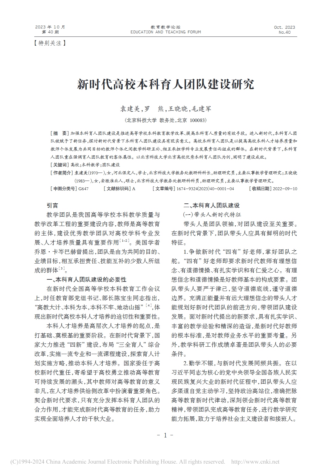 [67] 袁建美,罗熊,王晓晓,毛建军,新时代高校本科育人团队建设研究,教育教学论坛,2023,(40):1-4.