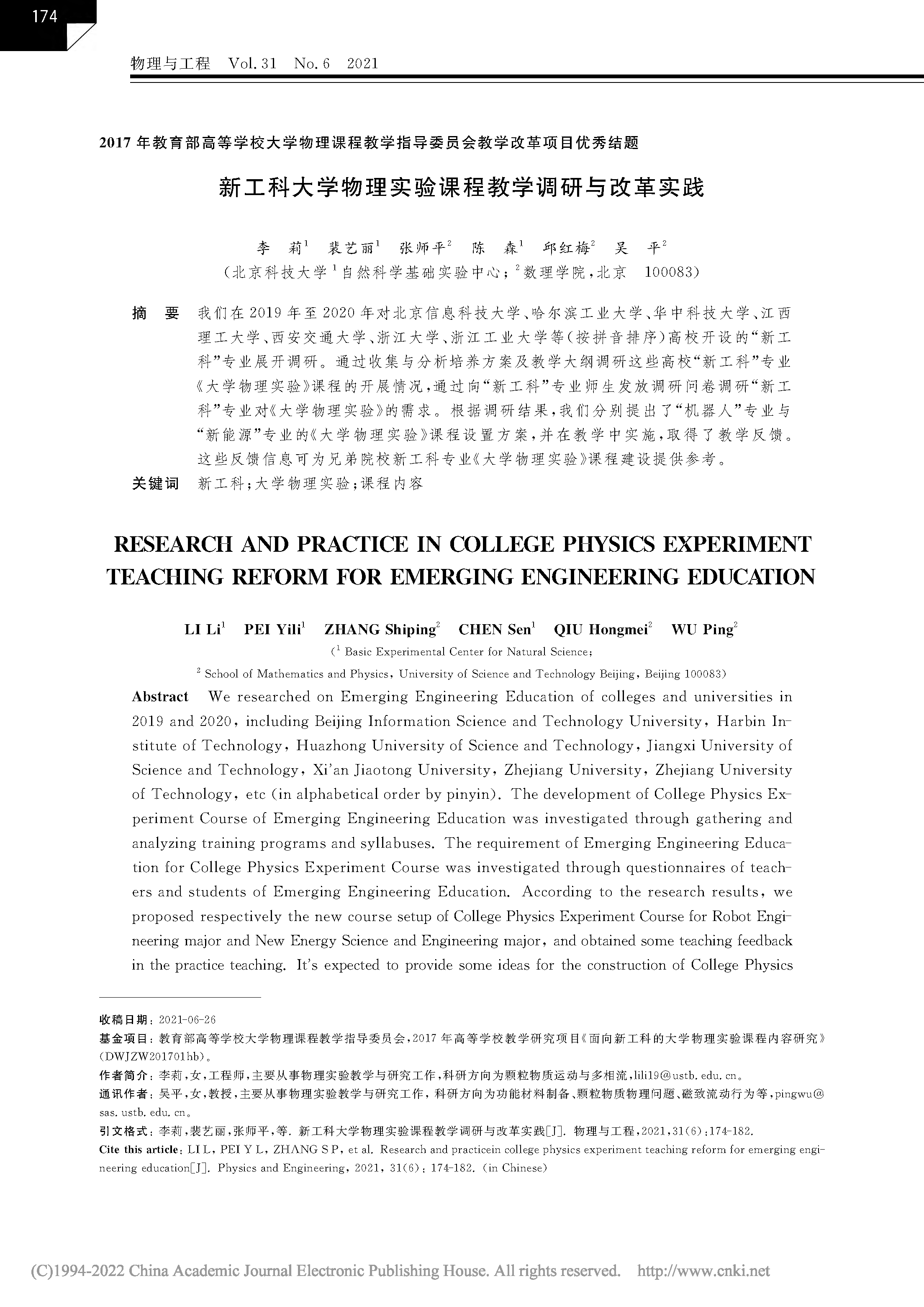[31] 李莉,裴艺丽,张师平,陈森,邱红梅,吴平,新工科大学物理实验课程教学调研与改革实践,物理与工程,2021,31(06):174-182.