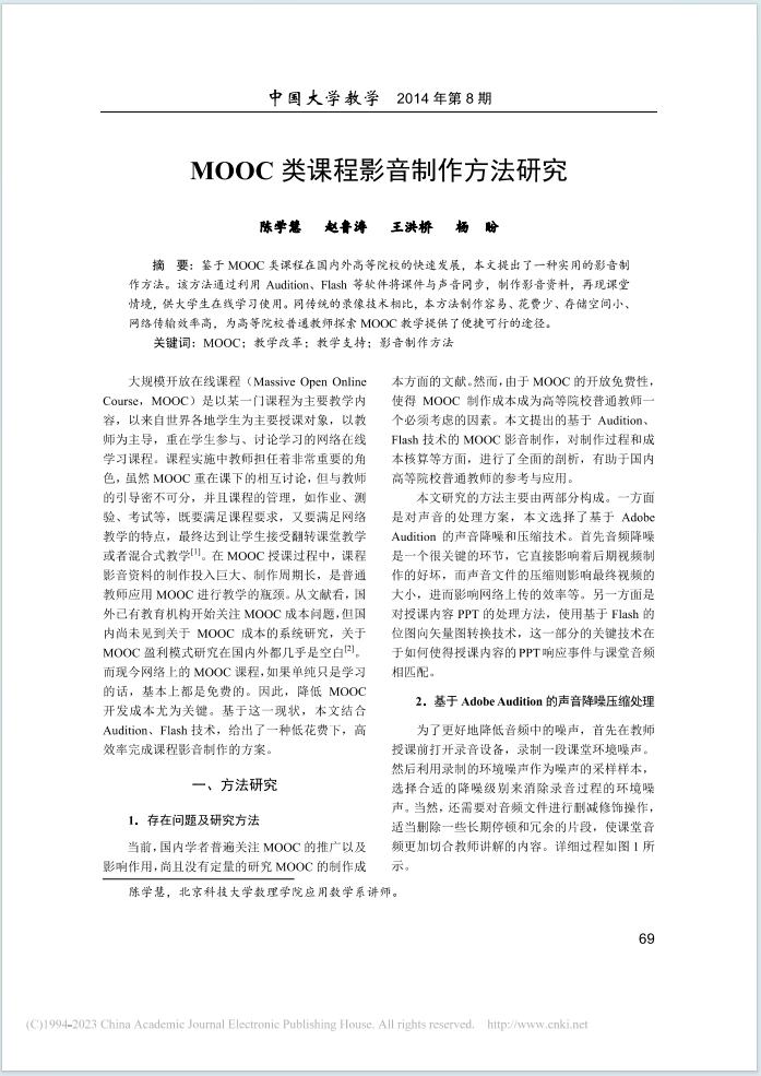 [2] 陈学慧,赵鲁涛,王洪桥,杨盼,MOOC类课程影音制作方法研究,《中国大学教学》,2014,8:69-72.
