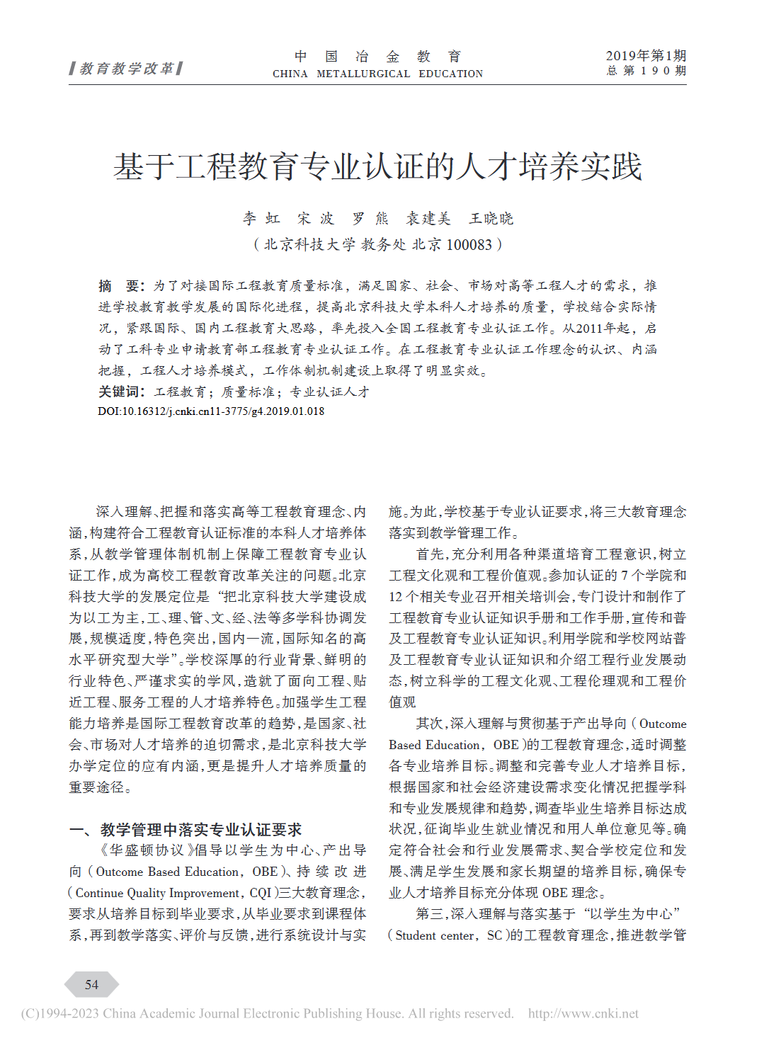 [69] 李虹,宋波,罗熊,袁建美,王晓晓,基于工程教育专业认证的人才培养实践,中国冶金教育,2019,(1):54-57.