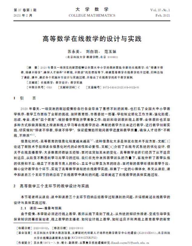 [7] 苏永美,刘白羽,范玉妹,高等数学在线教学的设计与实践,大学数学,2021,37(1):22-26.