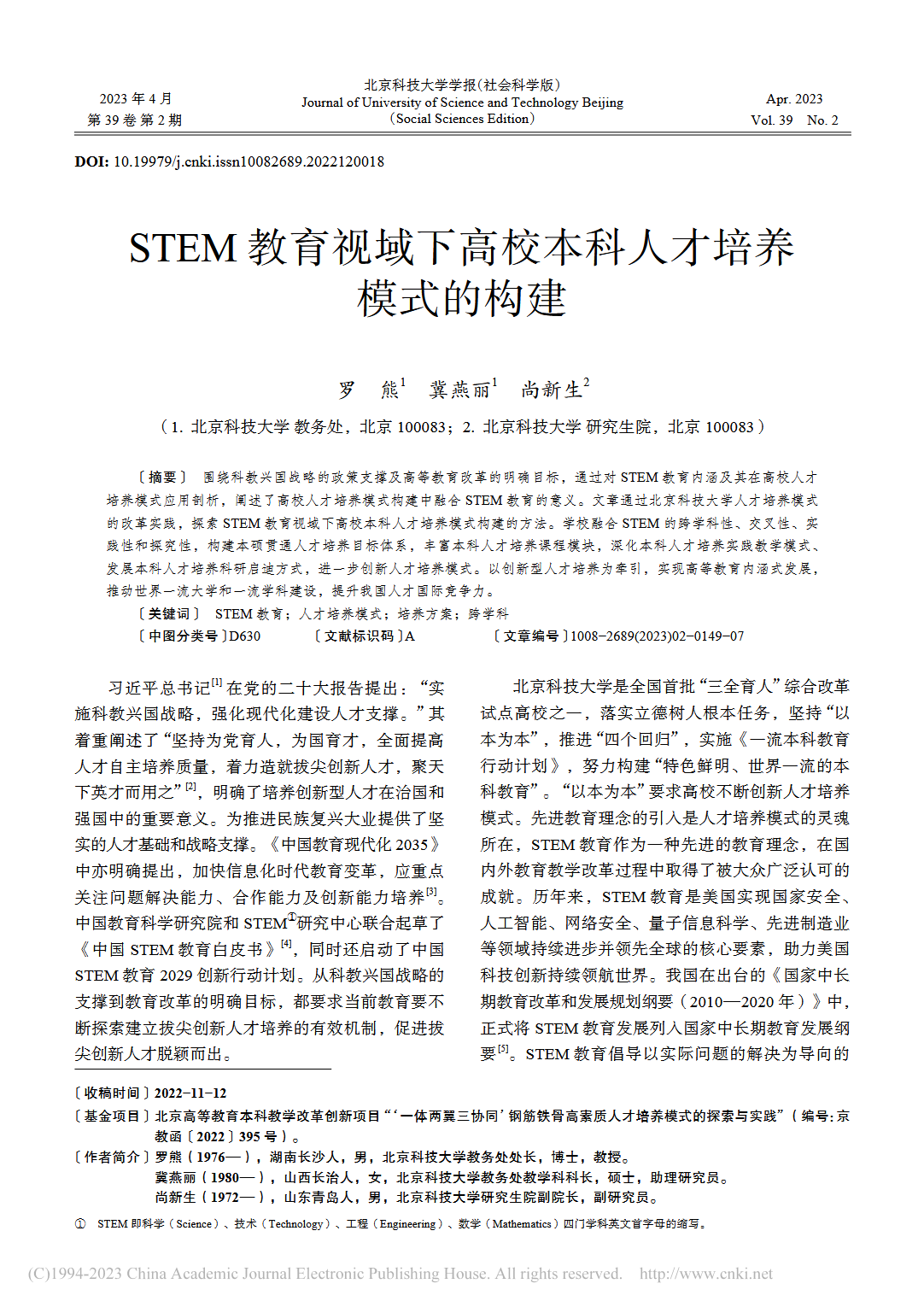 [40] 罗熊,冀燕丽,尚新生,STEM教育视域下高校本科人才培养模式的构建,北京科技大学学报(社会科学版),2023,39(2):149-155.