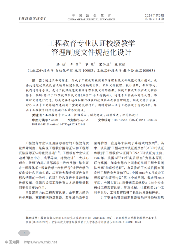[66] 杨旭,李擎,罗熊,宋洪庆,崔家瑞,工程教育专业认证校级教学管理制度文件规范化设计,中国冶金教育,2024,(5):8-13.