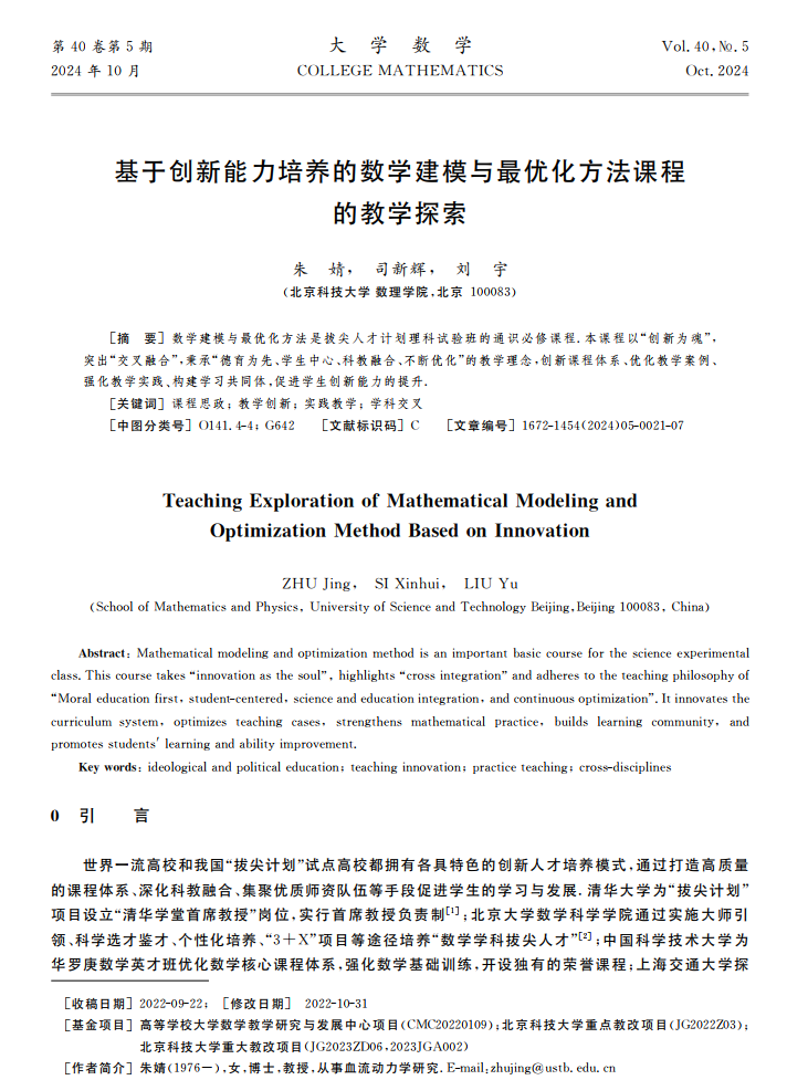 [34] 朱婧,司新辉,刘宇,基于创新能力培养的数学建模和最优化课程的教学探索,大学数学,2024,40(5):21-27.