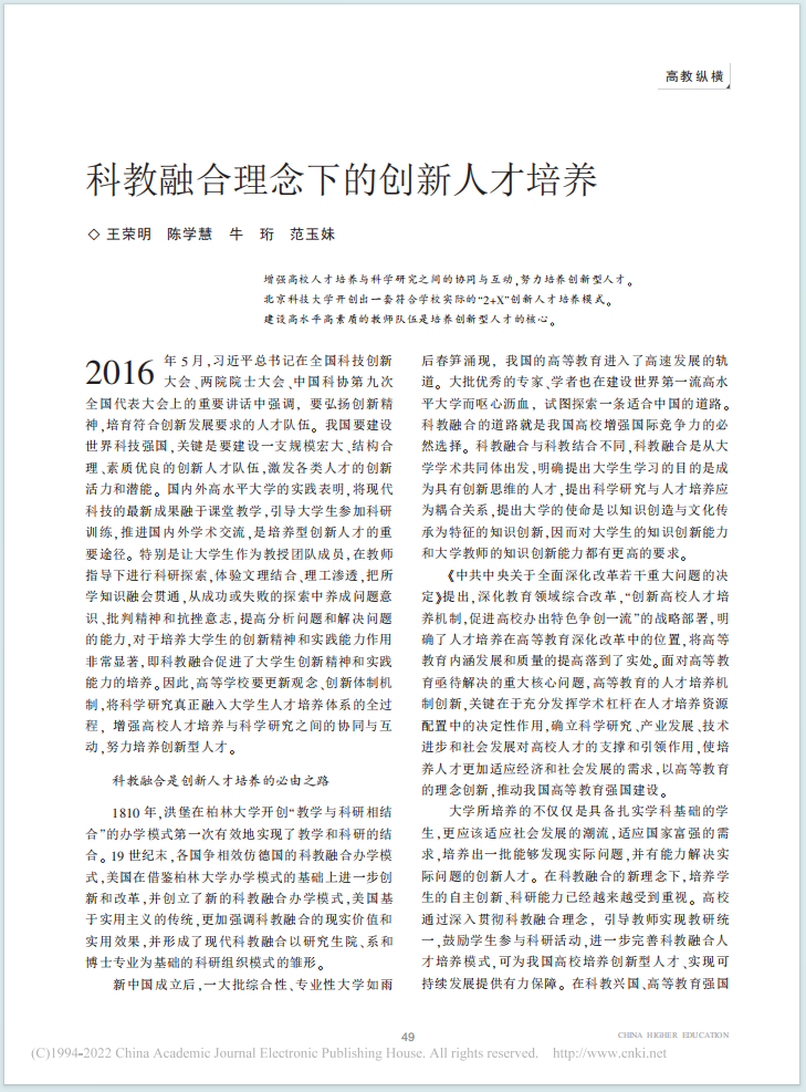[1] 王荣明,陈学慧,牛珩,范玉妹,科教融合理念下的创新人才培养,《中国高等教育》,2018,5:49-51.