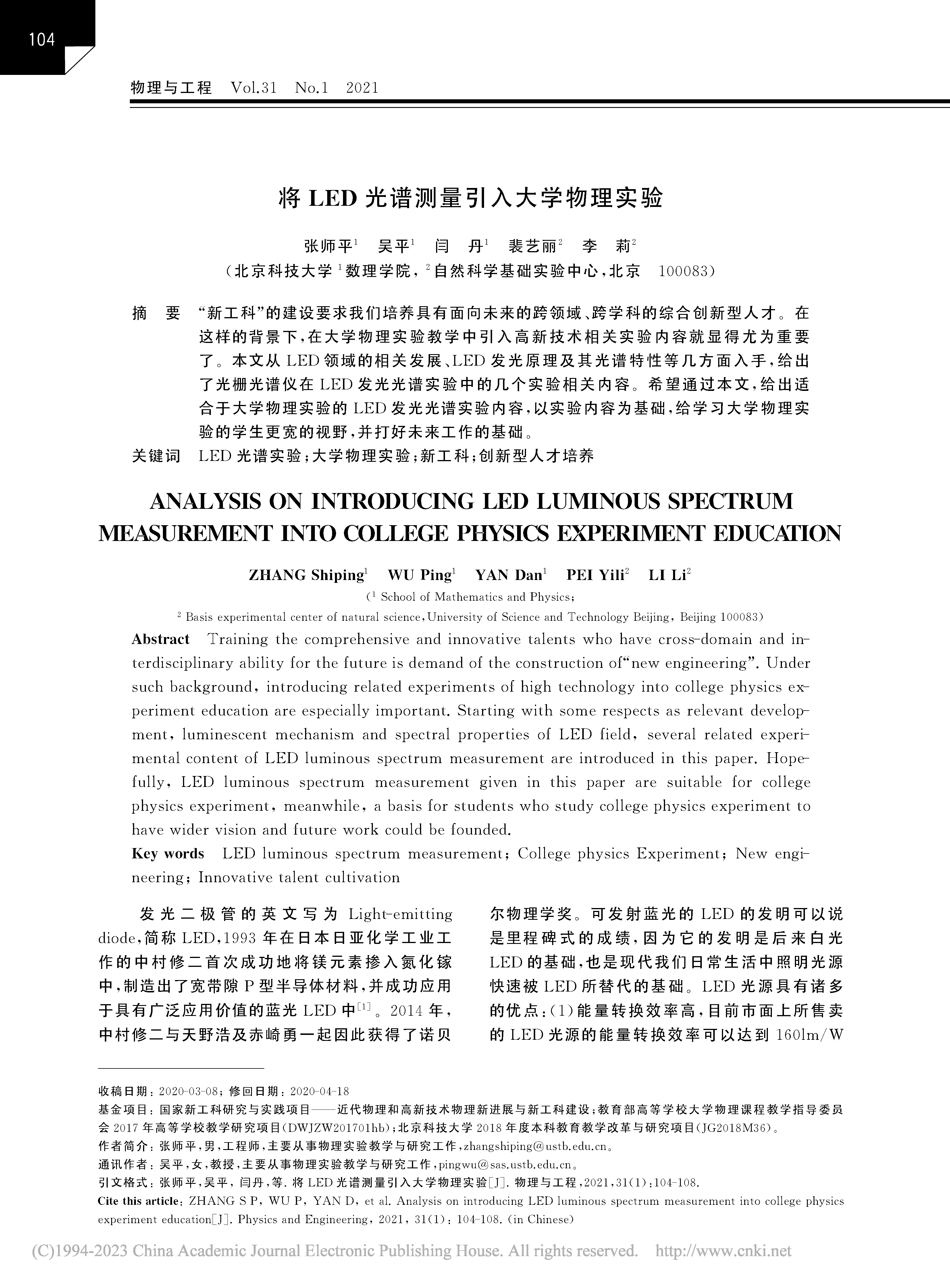 [21] 张师平,吴平,闫丹,裴艺丽,李莉,将LED光谱测量引入大学物理实验,物理与工程,2021,31(01):104-108.