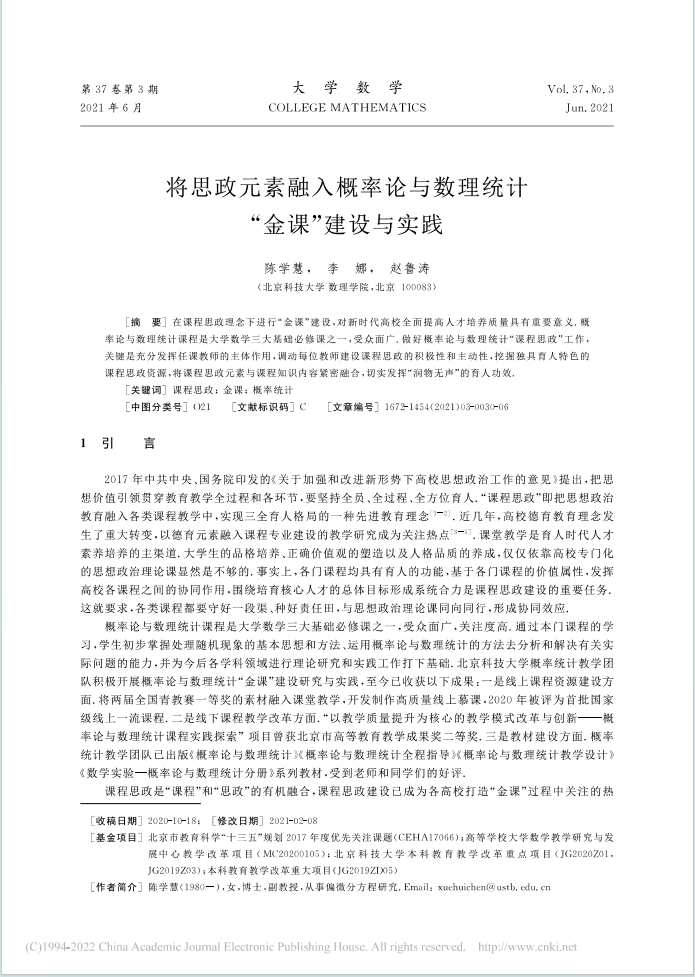 [9] 陈学慧,李娜,赵鲁涛,将思政元素融入概率论与数理统计“金课”建设与实践,大学数学,2021,37(3):30-35.