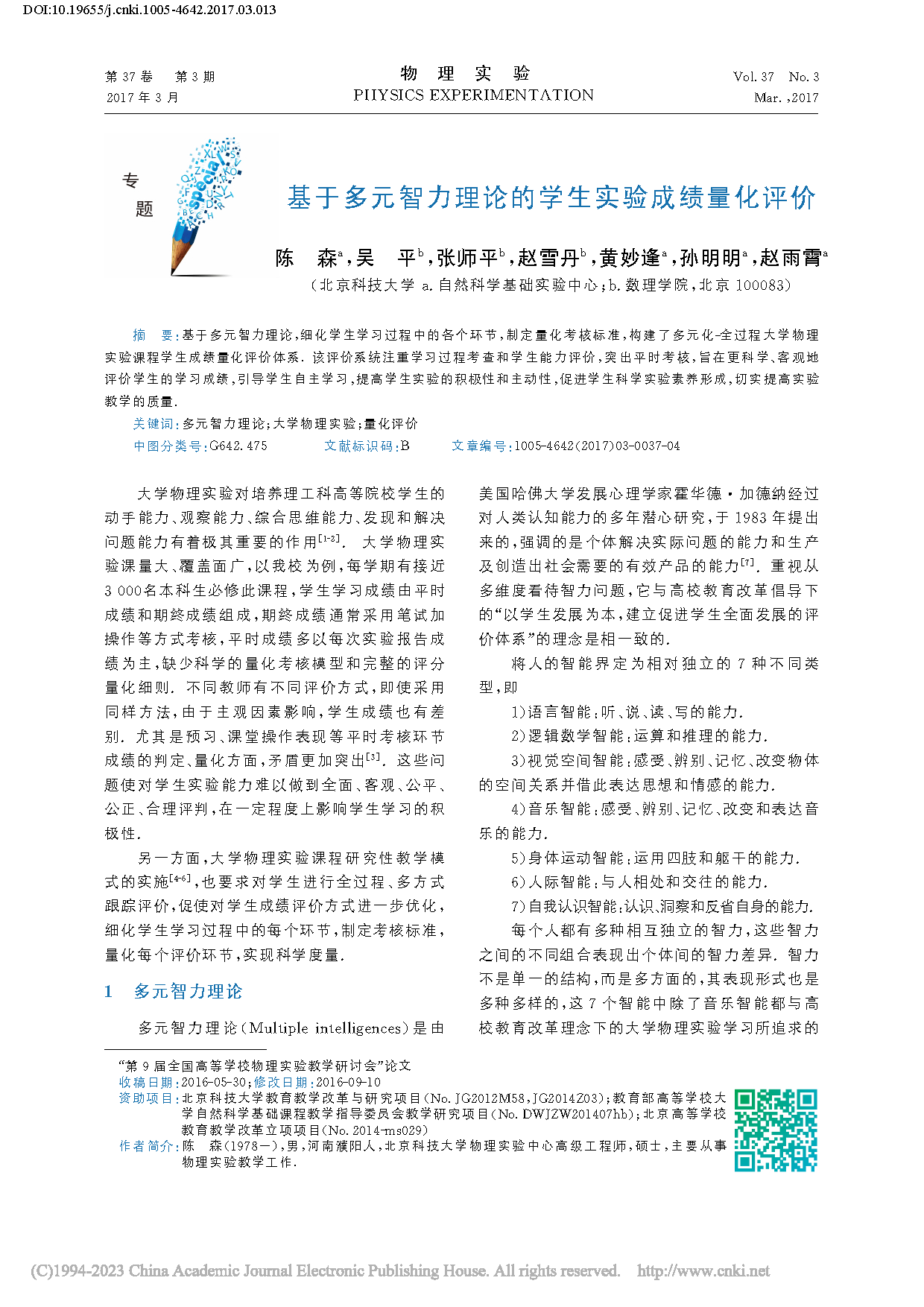 [51] 陈森,吴平,张师平,赵雪丹,黄妙逢,孙明明,赵雨霄,基于多元智力理论的学生实验成绩量化评价,物理实验,2017,37(03):37-40+47.