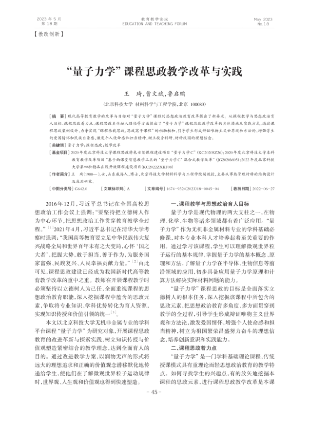 [36] 王琦,曹文斌,鲁启鹏,“量子力学”课程思政教学改革与实践,教育教学论坛,2023,(18):45-48.
