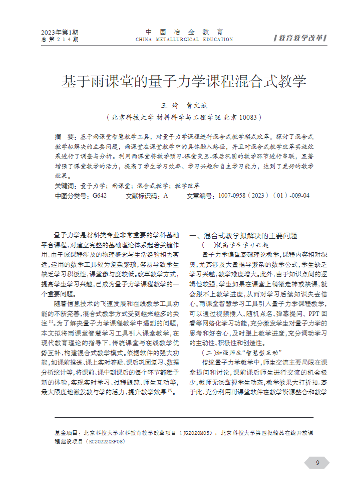 [59] 王琦,曹文斌,基于雨课堂的量子力学课程混合式教学,中国冶金教育,2023,(1):9-12.