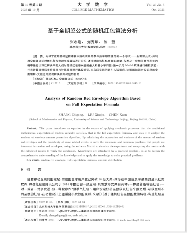 [16] 张志刚,刘秀芹,陈萱,基于全期望公式的随机红包算法分析,大学数学,2023,39(5):45-54.
