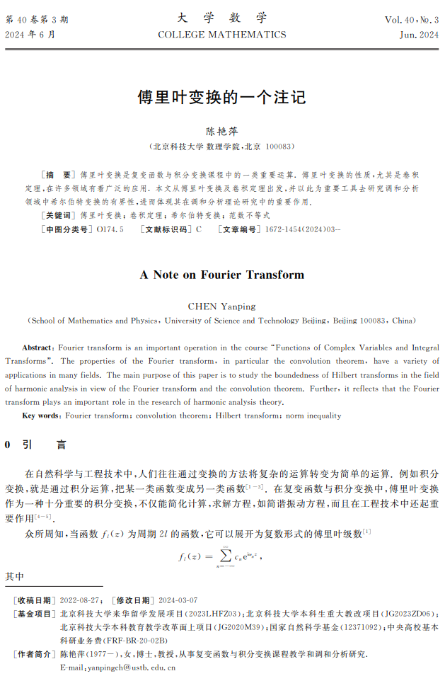 [71] 陈艳萍,傅里叶变换的一个注记,大学数学,2024,40(3):65-68.