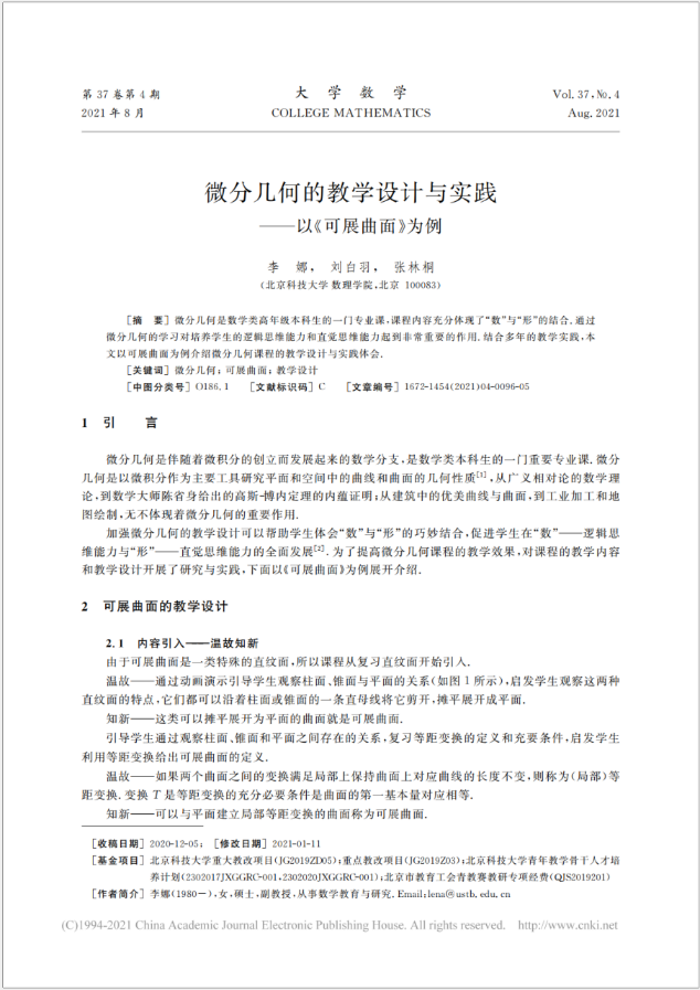 [10] 李娜,刘白羽,张林桐,微分几何的教学设计与实践——以《可展曲面》为例,大学数学,2021,37(4):96-100.