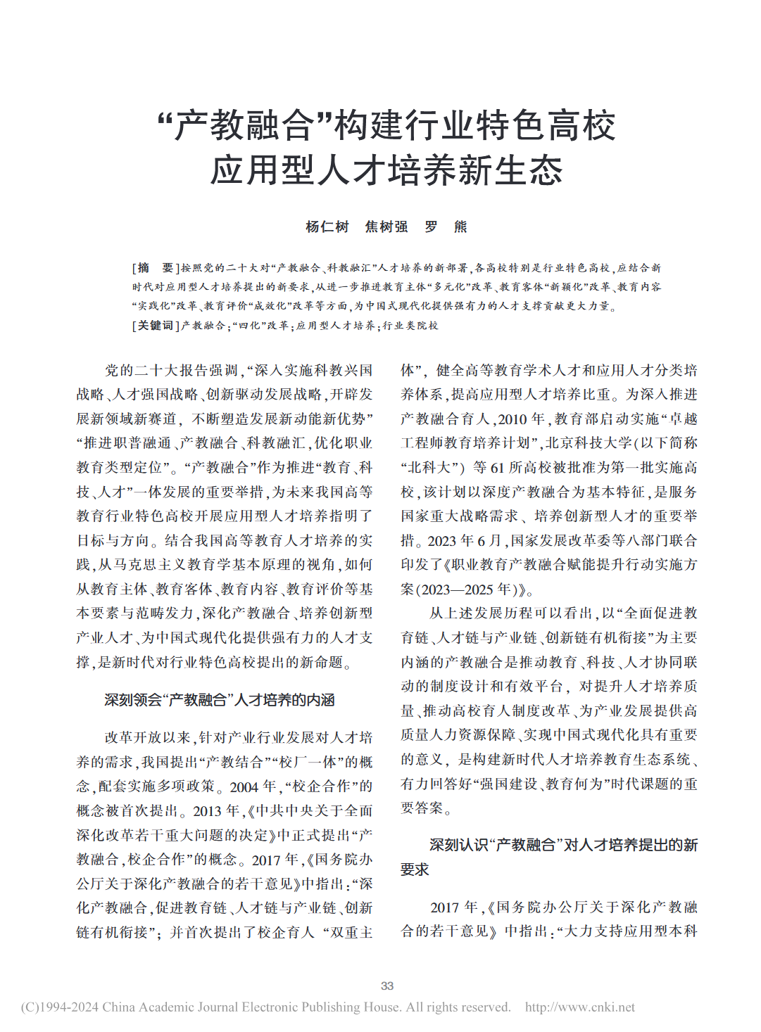 [61] 杨仁树,焦树强,罗熊,“产教融合”构建行业特色高校应用型人才培养新生态,中国高等教育,2024,(2):33-36.