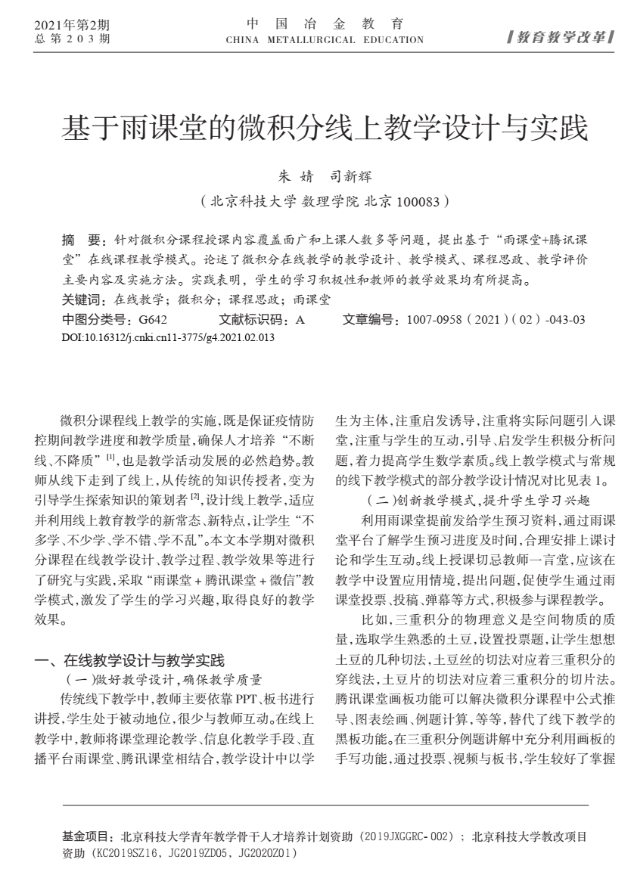 [54] 朱婧,司新辉,基于雨课堂的微积分线上教学设计与实践,中国冶金教育,2021,(2):43-45.