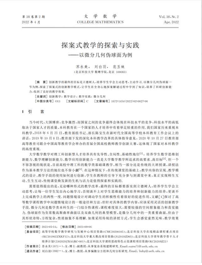 [12] 苏永美,刘白羽,范玉妹,探案式教学的探索与实践——以微分几何伪球面为例,《大学数学》,2022,38(2):27-32.