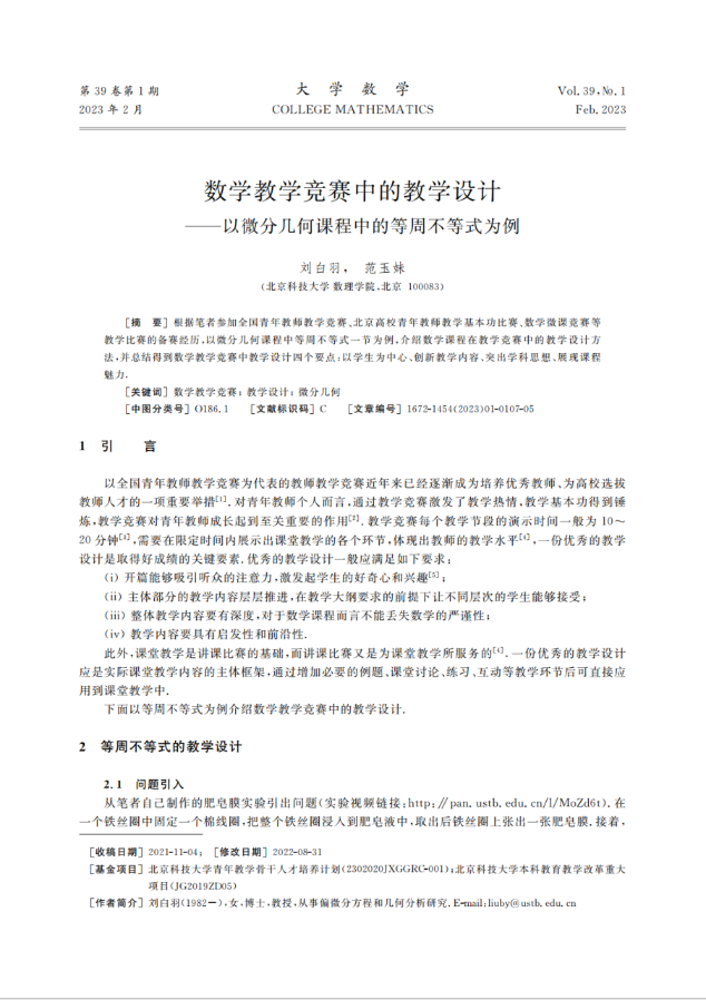 [15] 刘白羽,范玉妹,数学教学竞赛中的教学设计——以微分几何课程中的等周不等式为例,大学数学,2023,39(1):107-111.