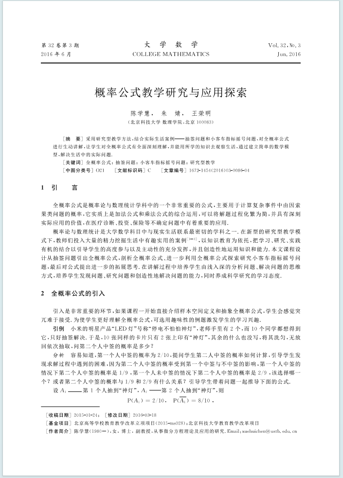 [6] 陈学慧,朱婧,王荣明,概率公式教学研究与应用探索,大学数学,2016,32(3):86-89.