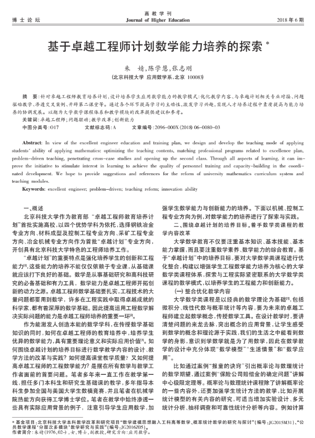 [21] 朱婧,陈学慧,张志刚,基于卓越工程师计划数学能力培养的探索,《高教学刊》,2018,(6):80-82.