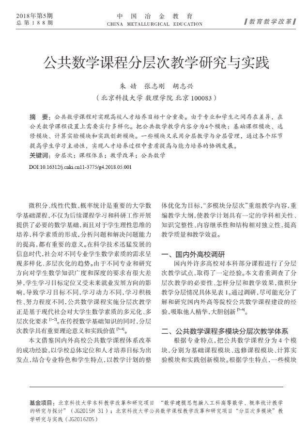 [20] 朱婧,张志刚,胡志兴,公共数学课程多层次教学研究与实践,《中国冶金教育》,2018(5):1-4.
