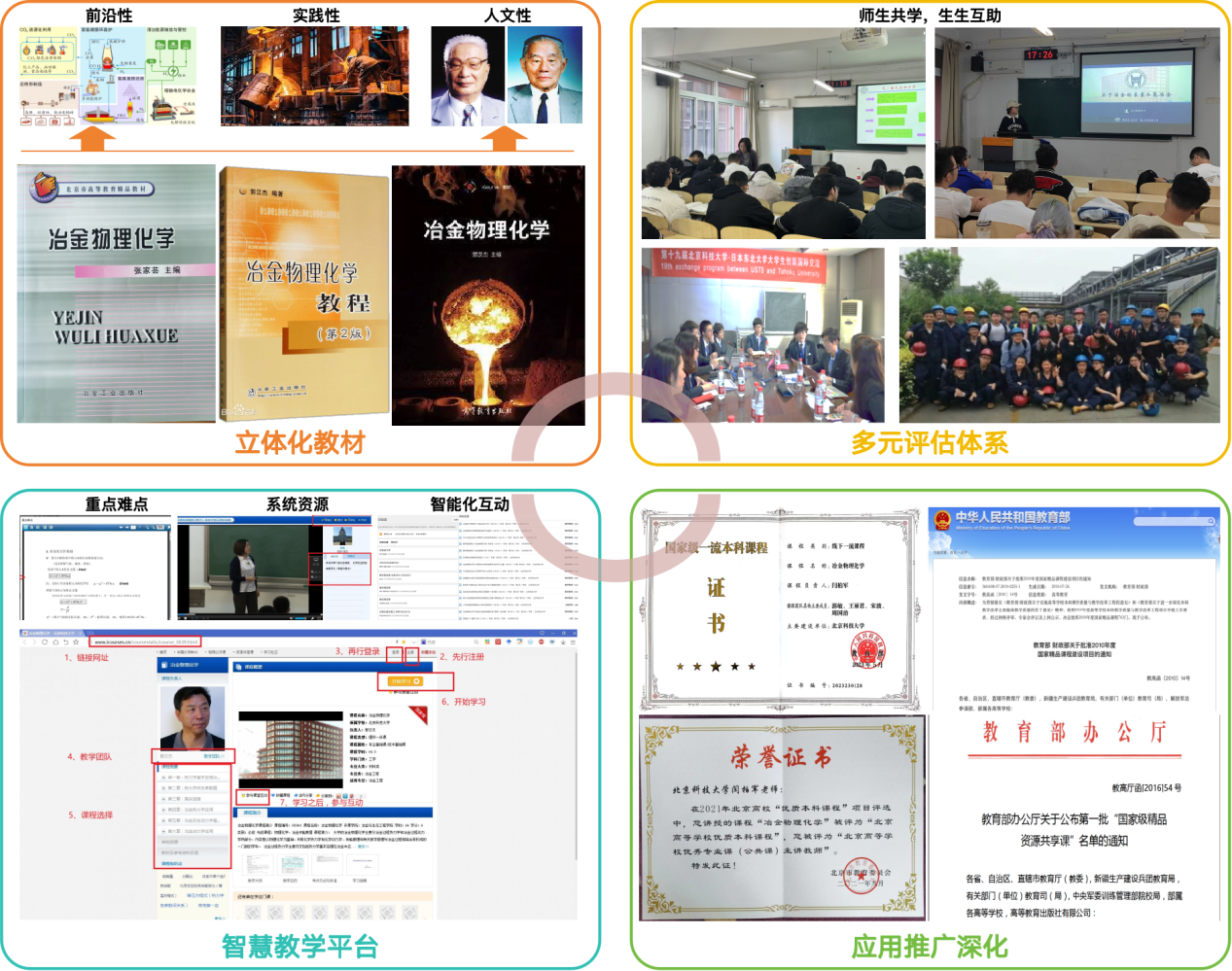 本成果在持续的应用与推广过程中,其创新理念和实践经验获得了广泛认可,并产生了积极的示范效应。成果支撑课程成功获评“国家级一流本科课程”和“北京高等学校优质本科课程”,为其他高校相关课程的建设提供了可借鉴的模式。承担本课程核心教学任务的教师荣获“北京高等学校优秀专业课(公共课)主讲教师”称号,同时教材也荣获“北京市高等教育精品教材”,其科学性、系统性和实用性得到了权威认可,教材的广泛应用进一步扩大了本教学成果的影响力。此外,基于本成果,《冶金物理化学》获评第二批“国家级一流本科课程”,并于2025年建成《冶金物理化学》AI课堂。