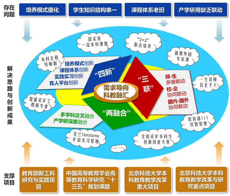 面向国家“新工科”战略与“双一流”建设需求,本团队自2017年起,针对传统矿业工程课程老化、培养模式僵化、实践与国际化不足等痛点,提出并落地“需求导向、科教融汇”的“4+3+2”人才培养体系:以“四个创新”贯通培养链条(模式、课程、实践、平台),以“三个联动”打通师生—校企—国内外协同,以“两个融合”强化多学科与产学研闭环,推动智能、绿色、深部开采方向的人才培养,实证提升学生的专业基础、科研思维、工程实践与创新能力,形成可复制的矿业新工科培养范式。