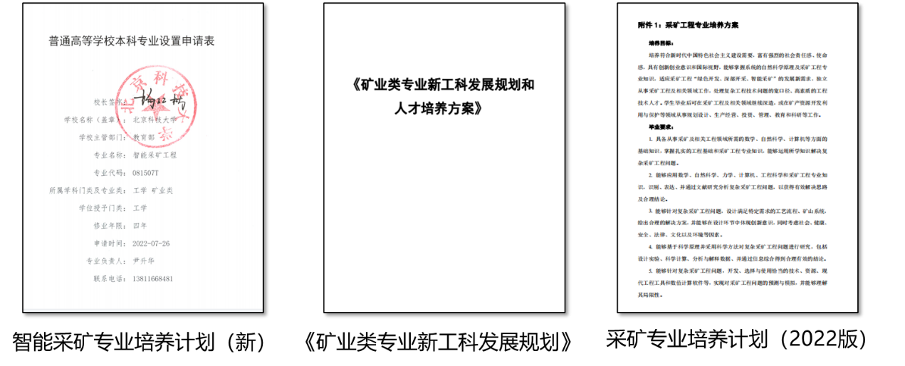 ① 获批了智能采矿工程新本科专业(《关于公布2022年度普通高等学校本科专业备案和审批结果的通知》(教高函〔2023〕3号)),融合了物联网、大数据、智能制造、智能感知等高新技术发展起来的新工科专业,为适应矿业智能低碳的人才培育提供模式创新;对传统工程教育理念、目标等进行改进升级,打造矿业类“3+1+2本硕贯通式培养”等新工科人才培养新模式。