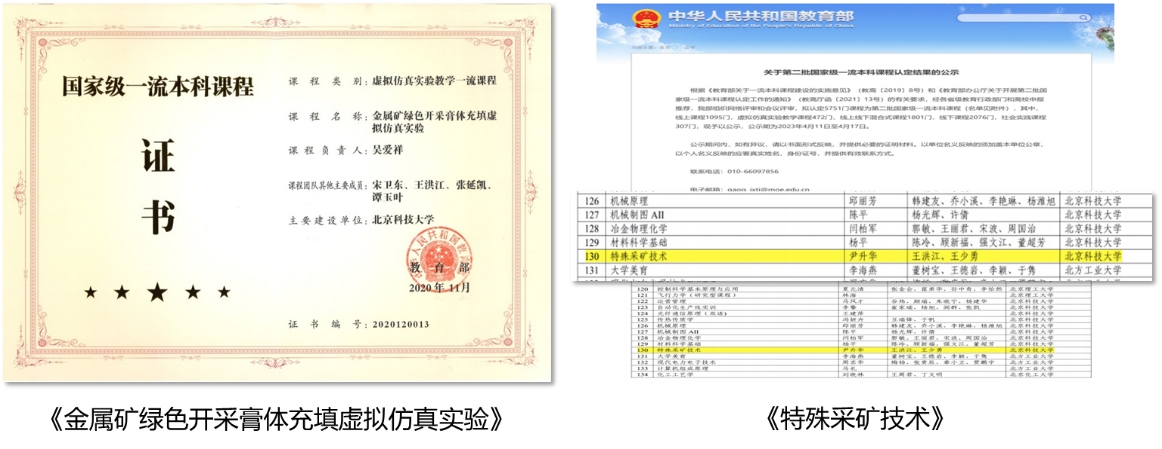 ② 实现了以第二批国家级一流本科课程(线下)《特殊采矿技术》、首批国家级一流本科课程(虚拟仿真实验平台)《金属矿绿色开采膏体充填虚拟仿真实验》为典型代表的新工科课程体系创新,结合矿业学科的发展前沿,推动开展采矿工程专业课程体系创新,引入了《Python基础及应用》、《矿山人工智能基础》、《未来采矿》、《智能爆破》等新工科课程,出版发行了《特殊采矿技术》等一系列高等教育规划教材,有力构建了“矿业+”新工科课程体系。