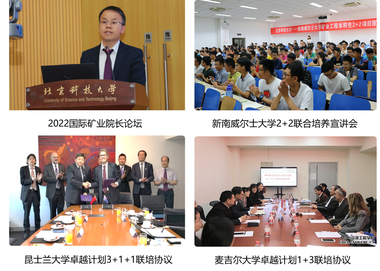 ③ 实现国内外教学资源联动,主办了2022国际矿业工程院长论坛(会议议题:工业4.0时代下矿业工程教育的转型之路)、北京科技大学-新南尔威士大学本科生“2+2”联合培养项目、北京科技大学-昆士兰大学本科生“3+1+1”联合培养项目、本科生外国专家课,实现国际化、多元化人才联动培养。