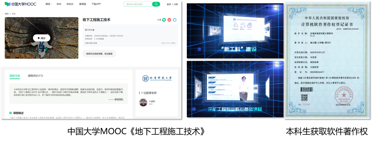 (3)聚焦复合型创新人才的能力要求,强化学生创新创业能力与实践转化能力培育,加速“两个融合”进程,即:多学科交叉融合、产学研深度融合。引入人工智能、大数据等多个交叉学科领域,建设和推广了MOOC精品在线课程《地下工程施工技术》等;推动产学研用,提出了以竞赛促进学生实践的方法,指导学生参加“北科大-日本东北大学大学生创新国际交流”、“全国采矿工程大学生实践作品大赛”等创新创业大赛,荣获国采矿实践作品大赛一等奖联网+”北京市一等奖等教学奖励与成果落地。
