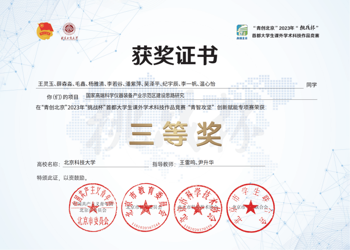 7. “青创北京”首都大学生课外学术科技作品竞赛(三等奖),2023,北京市教育委员会