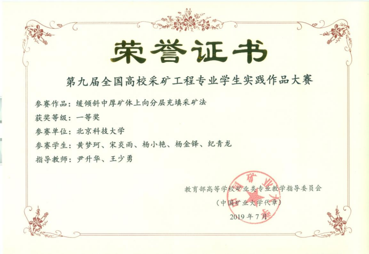 9. 第九届全国采矿学生实践作品大赛(一等奖),2019,教育部高等学校教学指导委员会