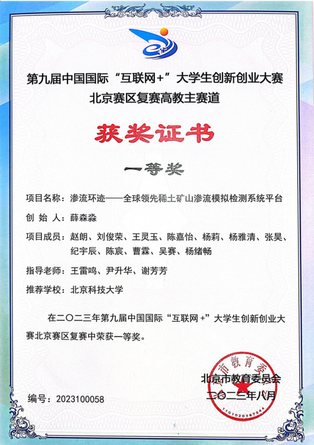 5. 第九届中国国际“互联网+”大学生创新创业大赛(北京赛区-高教主赛道,一等奖),2023,北京市教育委员会