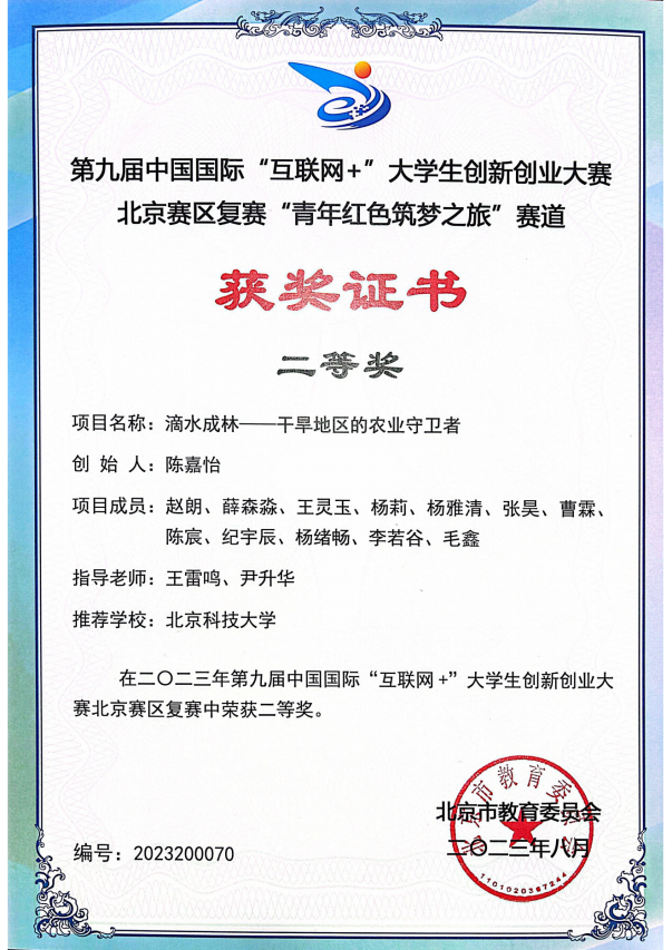 6. 第九届中国国际“互联网+”大学生创新创业大赛(北京赛区-青年红色筑梦之旅赛道,二等奖),2023,北京市教育委员会