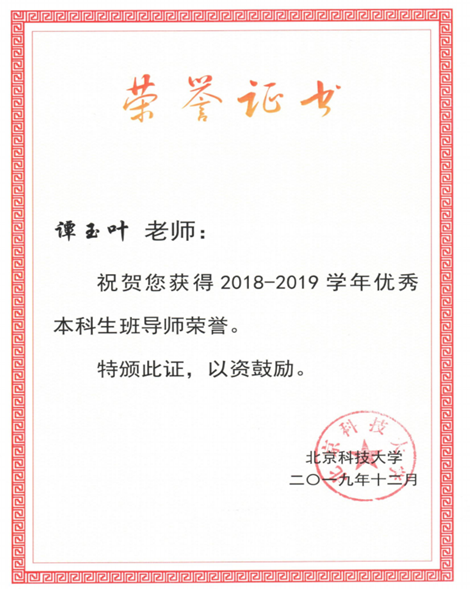 4.北京科技大学优秀本科班导师(一等奖),2019,北京科技大学,(谭玉叶)
